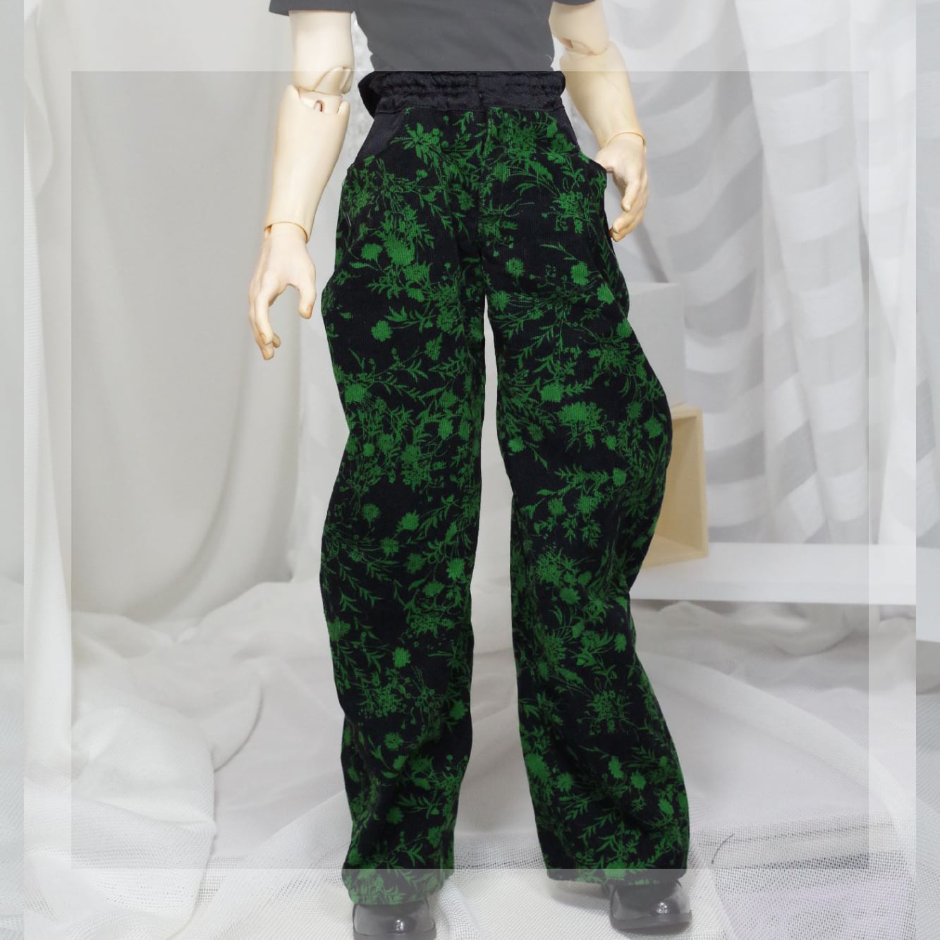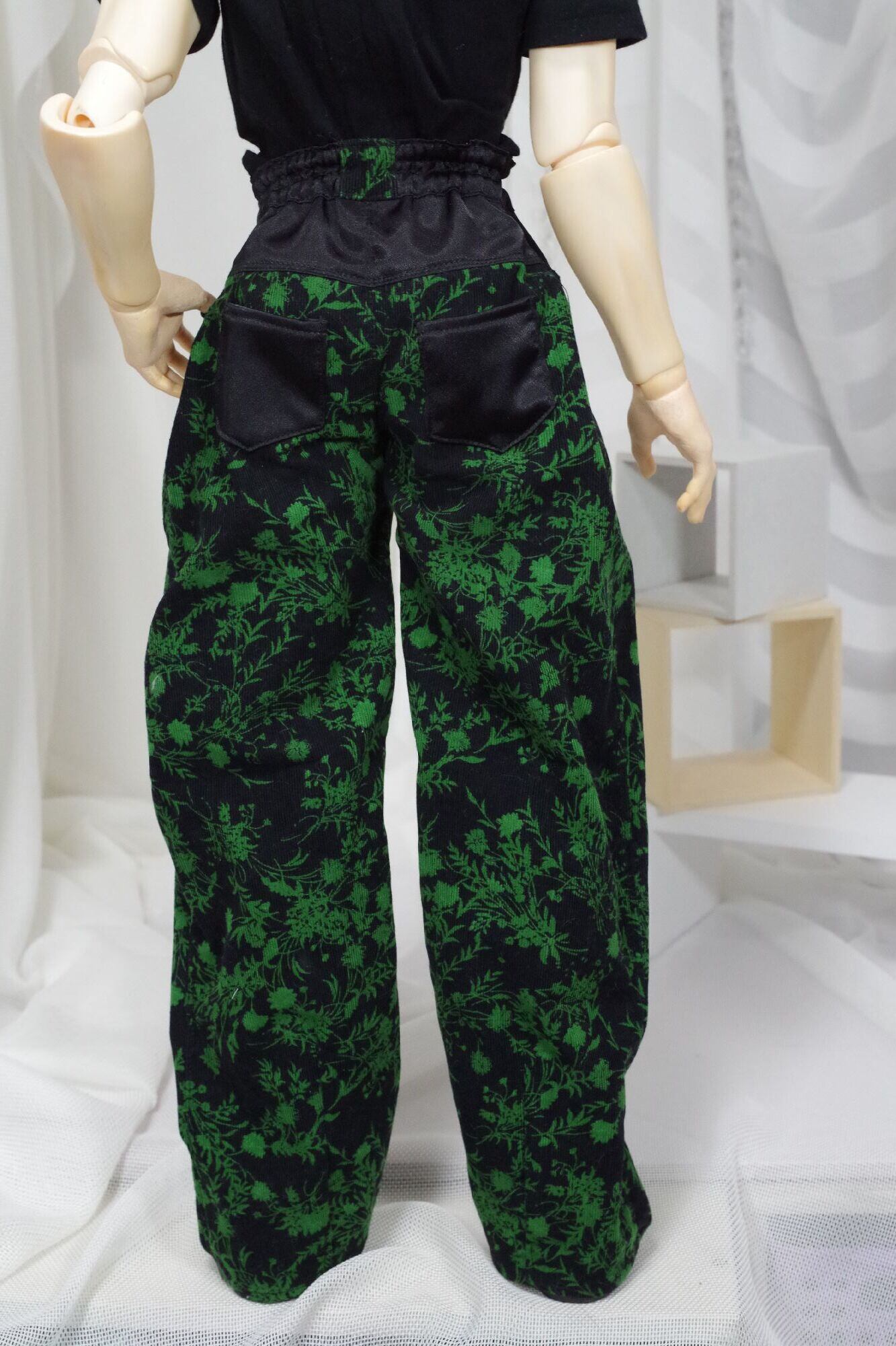 黒地に鮮やかなグリーンの花柄プリントと黒サテンの異素材の組み合わせが個性的な、コーデュロイ生地を使用したバレルレッグパンツです。